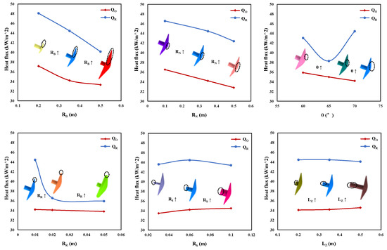 It can be seen from Figure 15 that changing RS and LZ has little effect on the distribution of the surface heat flux. Moreover, the value of QO and QR changes little. It is worth mentioning that, when LZ increases to 0.50 m, the heat flux between the stagnation point and shoulder point is larger than that with the small LZ. This may be related to the length no longer causing the delay of the low temperature reflux area. RS and LZ have little influence on the surface heat flux.