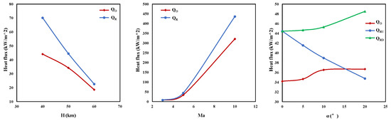 Heat flux distribution of changing H and Ma are shown in Figure 17 After the flight altitude of H changes, due to the obvious change in air density, the surface heat flux of the vehicle also changes significantly. The overall heat flux distribution decreases with an increase in H. When H = 40 km and Ma = 5, QR reaches 70 kW/m2 at the shoulder point. With an increase in Ma, aerodynamic heating is enhanced significantly. QR reaches 380 kW/m2, which is far beyond the thermal protection limits of ordinary materials when Ma = 10. Therefore, it is necessary to reduce speed at a lower altitude to reduce aerodynamic heating as much as possible.