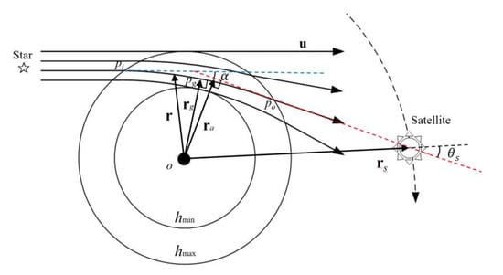 The star occultation is the process of viewing the rays from the direct to the obstructed by the Earth. For one thing, the denser the atmosphere is, the larger the refraction angle is. Therefore, the refraction angle is large when the starlight is close to the ground, and vice versa. Although the large refraction angle is good for improving its observing accuracy, the lowest tangent height is usually set as 20 km for the stellar refraction since the atmospheric density close to the troposphere fluctuates significantly []. The scintillation over 20 km due to internal gravity waves, turbulence, and other irregularities may impact on the stellar refraction to some extent, but its impact can be eased significantly by increasing the exposure time []. The impact of scintillation will not be considered in this paper anymore. For another, the refraction angle is small when the starlight is far from the ground. If the refraction angle is too small to be sensed by the star sensor, the corresponding height will be the upper limit of the occultation in fact. Therefore, the star occultation refers to the process of viewing the refracted starlight in a range of the tangent height, [hmin, hmax], as illustrated in Figure 1.