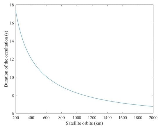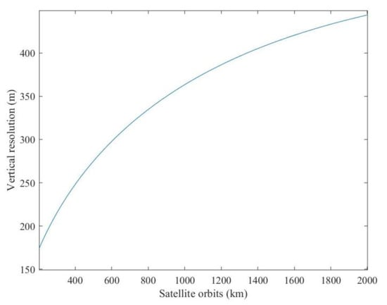 However, the vertical resolution of the retrieval of the stratospheric density is mainly dominated by the duration of the occultation and the sampling frequency of the refraction angle. Since the range of the altitude is constant in the occultation, the vertical resolution will be higher if the duration of the occultation lasts longer. The duration of the occultation is related to the orbit. Figure 2 depicts the duration of the occultation with the satellite orbits. In Figure 2, the duration of the occultation decreases with the increase of the orbit. If only the vertical resolution is concerned, the satellite’s orbit should be as low as possible. Of course, the atmospheric drag will increase significantly with the decrease of the orbit. Hence, the orbit of the satellite should be determined by trading off the vertical resolution against the satellite’s running life. Moreover, the vertical resolution is also related to the sampling frequency of the refraction angle, or the output frequency of the star sensor equivalently. The higher the output frequency of the star sensor is, the higher the vertical resolution is. It should be noted that the output frequency depends on the exposure time of the star sensor. Figure 3 depicts the vertical resolution with the orbit when the output frequency of the star sensor is 10 Hz. In Figure 3, the vertical resolution is as high as 180 m when the orbit is 200 km. Even though the orbit is as high as 2000 km, the vertical resolution is still less than 450 m, which is far higher than the vertical resolution by the GPS radio occultation.