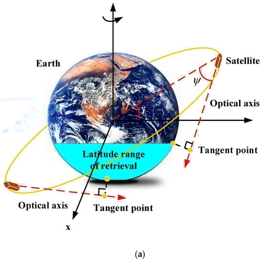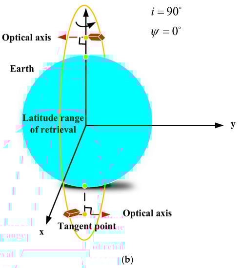 Schematic diagram of the latitude range of the retrieval. (a) Optical axis does not lie in the orbital plane and i < 90°. (b) Optical axis lies in the orbital plane and i = 90°.