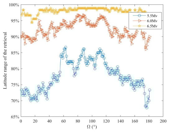 However, the coverage of the retrieval of the stratospheric density in the latitude range is related to not only the orbit (its inclination and Right Ascension of the Ascending Node (RAAN) ) but also the star sensor (its direction of the optical axis and the magnitude threshold). Figure 4 illustrates the relationship of the latitude range of the retrieval with the inclination and the angle between the optical axis of the star sensor and the orbital plane . In Figure 4a, the optical axis of the star sensor does not lie in the orbital plane and . The two cases of the occultation at the minimum and the maximum latitudes are illustrated. The green area shows the latitude range of the retrieval. Obviously, when the optical axis of the star sensor lies in the orbital plane (), the polar orbit () should be employed to accomplish the retrieval in the whole latitude range, as illustrated in Figure 4b. Figure 5 depicts the latitude range of the retrieval with the RAAN and the magnitude threshold when , , and the magnitude thresholds of the viewed stars are 5.5 Mv, 6.0 Mv, and 6.5 Mv, respectively. Mv refers to the apparent magnitude. If the latitude range approaches to 100%, the stratospheric density in all the latitude range of [−90 deg, 90 deg] can be retrieved approximately. In Figure 5, the latitude range of the retrieval is large when is close to 90°. Moreover, the impact of on the latitude range of the retrieval decreases with the increase of the magnitude thresholds, since more dark stars can be observed if the magnitude threshold of the viewed stars is improved.