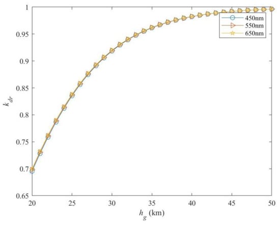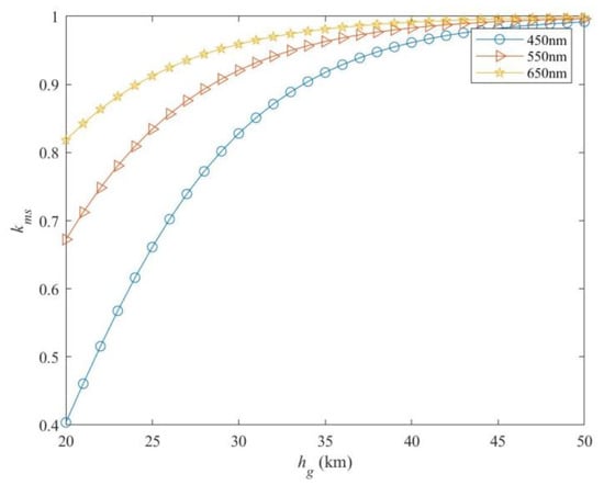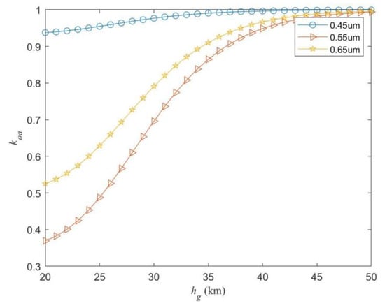 where is the coefficient of the ozone absorption and is the equivalent ozone thickness in the starlight path. The coefficient is related to the wavelength . In the standard ozone profile, the values of with the wavelengths of 450 nm, 550 nm, and 650 nm are 0.007, 0.113, and 0.073, respectively []. Figure 8 depicts the attenuation due to the ozone absorption with the tangent height. In Figure 8, the attenuation due to the ozone absorption increases as the tangent height decreases too. It is also noted that the rays of the starlight with the wavelength of 550 nm are attenuated more significantly than that with the wavelength of 650 nm at the same tangent height. The rays of the starlight with a wavelength of 450 nm were attenuated slightly by the ozone absorption [].