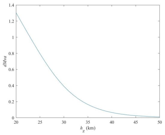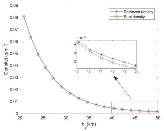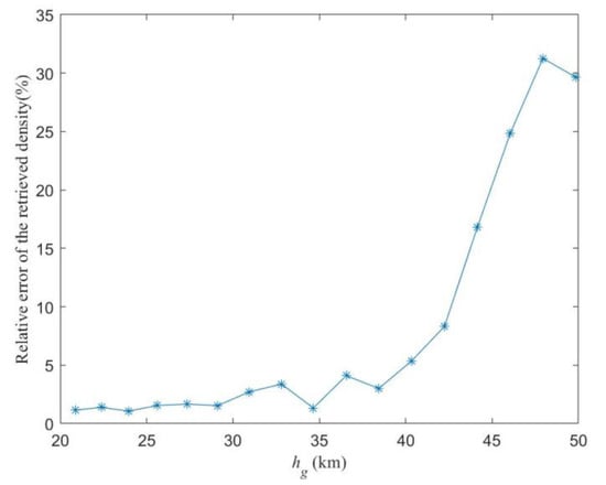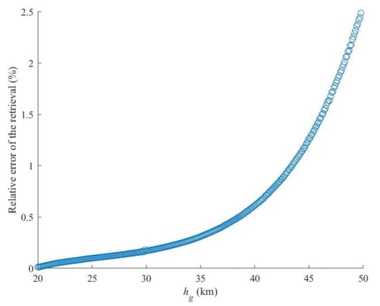 The retrieval of the stratospheric density by the star occultation was derived with some assumptions. Inevitably, the assumptions, including the spherically stratified atmosphere, the occultation starting from the highest tangent height , and the occultation implemented discretely, will lead to the error of the retrieval. Figure 11 depicts the relative error of the retrieval of the stratospheric density due to the assumptions with the tangent height by comparing with the real stratospheric density. The stratospheric density was retrieved by the method proposed in Section 2. The real stratospheric density was acquired from the NRLMSISE-00 data with the high resolution, which is introduced in Section 6. The NRLMSISE-00 data recommended by the International Committee on Space Research (COSPAR) was developed by the US Naval Research Laboratory []. It is based on both mass spectrometry and incoherent radar scatter data and drag and accelerometer data. In Figure 11, the assumption-derived error increases as the tangent height increases. The assumption-derived error is negligible when the tangent height is 20 km, but it is about 2.5% when the tangent height is 50 km. If the tangent height is no higher than 35 km, the assumption-derived error is no more than 0.5%.