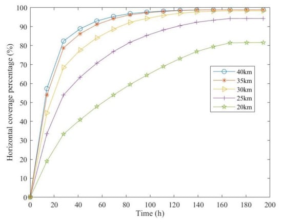 Figure 9 depicts the difference with the tangent height. As expected, the difference decreases as the tangent height increases. That is, the equivalent apparent magnitude is larger if the tangent height is lower. For example, if the ray of the starlight with the apparent magnitude of 5 Mv passes through the stratosphere at the tangent height of 20 km, its apparent magnitude will turn to 6.5 Mv when it is sensed by the star sensor according to (15). Hence, many stars will not be sensed by the star sensor in the occultation due to the attenuations, which is not good for improving the horizontal resolution of the retrieval of the density. Figure 10 depicts the horizontal coverage percentage with time if the latitude and longitude resolutions are 1° and 5°, respectively, and the magnitude threshold of the star sensor is 7 Mv. Since the Earth is rotating, the horizontal coverage percentage should increase with time. In Figure 10, the horizontal coverage percentage decreases as the tangent height decreases. If the tangent height is 35 km, the horizontal coverage percentage approaches to 100% after 100 h. However, the horizontal coverage percentage is just about 82% after 160 h if the tangent height is 20 km. Hence, the tangent height should be as high as possible if only the attenuation is concerned. Otherwise, more satellites are required to improve the horizontal coverage.