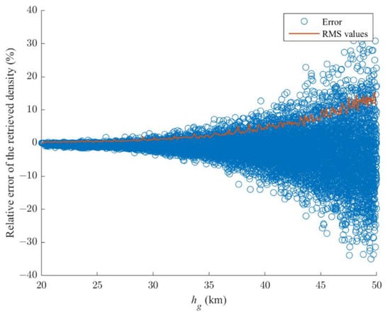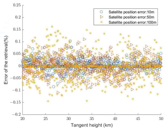 Fortunately, the LEO satellite can achieve 10 m-level positioning with a GNSS receiver. Figure 12 depicts the relative error of the retrieval of the stratospheric density due to the satellite position error with the tangent height by 600 times of the Monte Carlo simulations. In Figure 12, the relative error of the retrieval due to the satellite position error is irrelative with the tangent height. The RMS (Root Mean Squared) values of the relative error of the retrieval are 0.039%, 0.055%, and 0.061%, respectively, when the satellite position errors are 10 m, 50 m, and 100 m, respectively. Hence, the satellite position error has little impact on the accuracy of the retrieval.