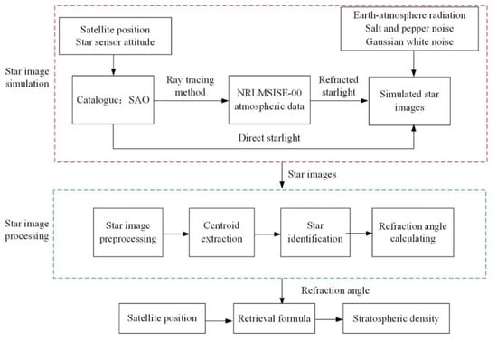 Herein, the accuracy of the retrieval of the stratospheric density by the occultation will be verified by simulations comprehensively. The orbit listed in Table 1 and the star sensor listed in Table 2 are still employed in the following simulations. The flowchart of the simulations is illustrated in Figure 14.