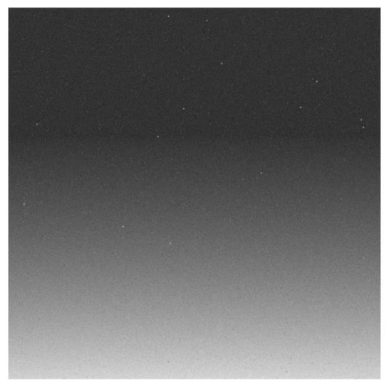 The star images are simulated using the SAO (Smithsonian Astrophysical Observatory) star catalogue J2000. As listed in Table 2, only the stars with the magnitude no greater than 7 Mv were simulated. The rays of the refracted starlight are simulated by the ray tracing method. The attenuation due to the refractive dispersion, the molecular scattering, and the ozone absorption were considered in simulating the refracted stars. Except for the Gaussian white noise and the salt-and-pepper noise, the earth–atmosphere radiation was also simulated in the star images. Figure 15 depicts a simulated star image output by the star sensor. The white points in the image are the viewed stars. In the upper part of the image, the background is black since there is no impact of the atmosphere. The starlights in the upper part are not refracted, but those in the lower part are refracted and attenuated by the atmosphere. Since the lowest part of the image is close to the ground, some starlights are blocked. The refracted starlights are attenuated by the atmosphere either. The simulated atmospheric radiation from the Earth to space in the visible band of the star sensor makes the lower part of the image white. There is both Gaussian white noise and salt-and-pepper noise in the image.
