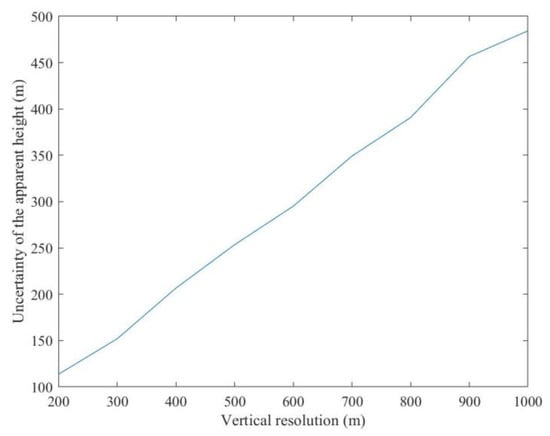 According to the analysis in Section 3, the vertical resolution is 200 m for the retrieval herein. The horizontal coverage percentage in 100 h reaches 96% if the latitudinal and the longitudinal resolutions of the retrieved stratospheric density are 1° and 5°, respectively. In a small region, the spherically stratified atmosphere has little impact on the navigation by the stellar refraction. That is, the impact of the horizontal resolution on the navigation can be neglected if the latitudinal and the longitudinal resolutions of the retrieved stratospheric density are as high as 1° and 5°, respectively. However, the vertical resolution will impact on the navigation directly. Figure 19 depicts the uncertainty on the apparent height with the vertical resolution of the atmospheric data. Herein, as mentioned above, the apparent height acquired by using the atmospheric data with the vertical resolution of 10 m was treated as the reference. That is, the uncertainty on the apparent height with a vertical resolution of the atmospheric data, rv, is the difference between the apparent height with rv and that with the vertical resolution of 10 m. In Figure 19, the uncertainty on the apparent height was approximately proportional to the vertical resolution. Hence, both the accuracy of the retrieval and the vertical resolution should be taken into account in evaluating the impact of the retrieved density on the navigation comprehensively. For example, according to simulations, the RMS value of the uncertainty on the apparent height was 166 m if the relative error of the retrieval was 0.9% at the tangent height of 30 km and the vertical resolution was 200 m by the star occultation. However, the RMS value of the uncertainty on the apparent height is 735 m if the relative error of the retrieval is 0.3% under the tangent height of 30 km and the vertical resolution is 1.4 km by the GPS radio occultation. Hence, the retrieval by the star occultation is more suitable for the navigation by the stellar refraction to achieve a higher accuracy than that by the GPS radio occultation.