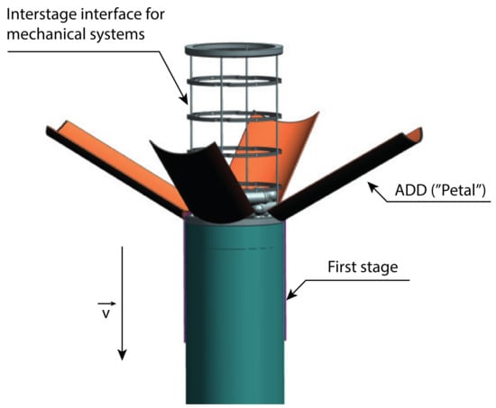 Microlaunchers are considered a strategic asset to achieve high frequency, tailored access to space for small satellites [1]. The addition of first stage reusability lowers costs and improves business sustainability. However, the structural mass does not scale linearly with the launchers’ size, leading to microlaunchers having comparatively higher structural coefficients with respect to conventional launchers, such as Ariane 5, Soyuz, and Falcon 9 [2]. This affects the launchers’ performance and thus the economic viability. To address this challenge, novel lightweight solutions are required for primary structural components. Additionally, to reduce wet and dry mass as well as complexity, passive re-entry and landing concepts can be considered. This, among others, is the aim of the feasibility studies led within the framework of the research project “Recovery and Return To Base” (RRTB) funded through the European Horizon 2020 programme [3]. In particular, the project aims to perform a re-entry flight phase without the use of retro-propulsion to achieve deceleration. Four mechanically actuated aerodynamic drag devices (ADDs), as shown in Figure 1, are extended from the rocket body to achieve the desired ballistic coefficient and obtain a sufficient deceleration during the re-entry and descent flight phase.