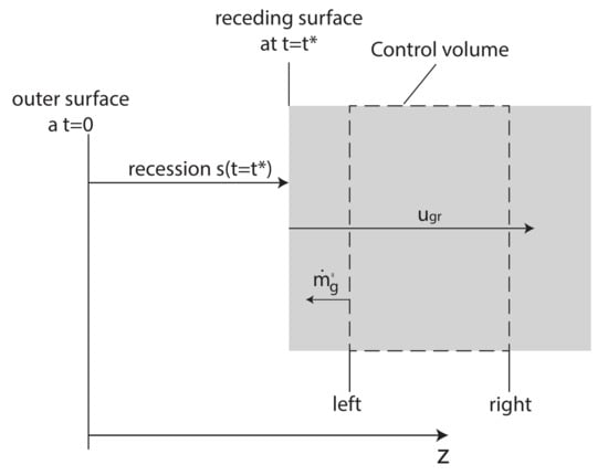 The virgin material is generally assumed to be impermeable, thus forcing all gas to leave through the outer surface [26]. All the material that did not remain solid, i.e., transitioning from virgin to char status, is in gaseous form. Thus, for an internal control volume, as depicted in Figure 2, the pyrolysis gas mass flux is related to the decomposition from virgin to charred material, described in Equation (4), via mass conservation: