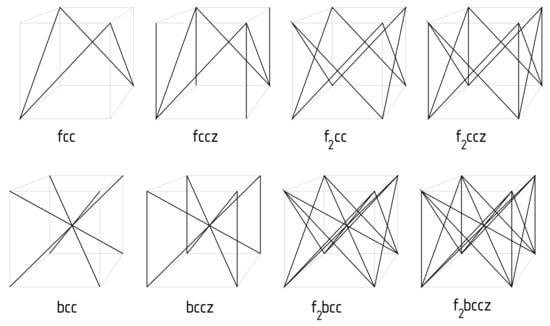 Orthotropic cell geometry leads to an orthotropic effective thermal conductivity tensor of the composite. Several types of lattice cores exist. The ones most investigated in the literature are the cubic ones inspired by Bravais crystals; see Figure 4. Excluding the bcc cell, which exhibits an isotropic morphology, cubic arrangements of these cells exhibit orthotropic behaviour.