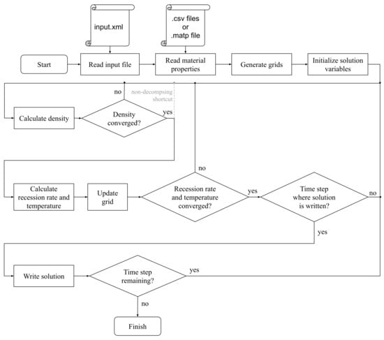 Using the governing equations described above, a software tool based on the finite volume method (FVM) for the calculation of the thermal response of both ablative and corrugated core ITPS is implemented in Python®. The implementation in Python® allows a simplified connection of the realised solver with different optimisation packages, which allow one to optimise the thermal mass. This way, an easy and accurate comparison of the two options is achievable. For this reason, the tool is named Hot-Structure and Ablative Reaction Shield Program (Hot-STARSHIP). Figure 5 shows a flowchart of the program.