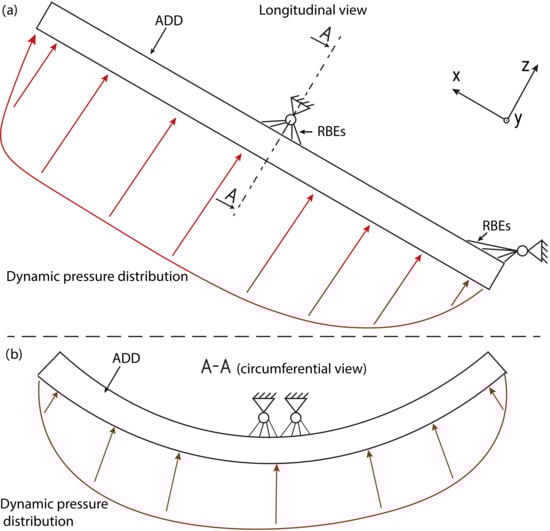 The ADD is extended via a group of mechanisms with two anchoring points on the structure. One at the root, the other at half of the ADD’s longitudinal length, as schematically shown in Figure 7. Rigid body elements are used to connect the fixation points to the structure. All translational and two rotational degrees of freedom (DOFs) are restricted. Only the rotational DOF about the y-axis is not.
