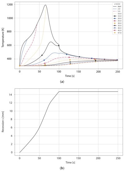 where is the wall temperature, the enthalpy of the gaseous surface reaction products, and p the pressure [29]. The enthalpy flux that is carried away from the material can then be calculated using . The charred material mass flux can be connected to the surface recession rate via: