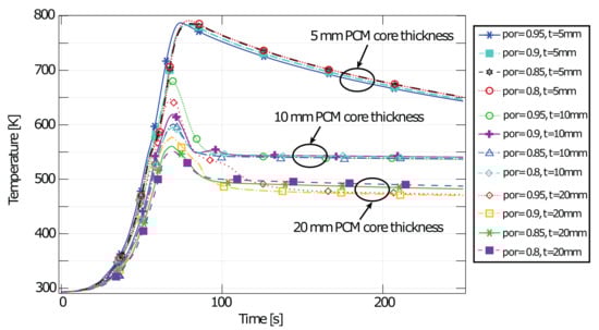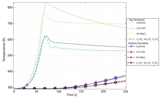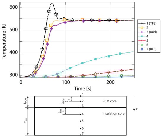 The solution of the problem associated with the composite of metallic lattice core and embedded PCM is not implemented in Hot-STARSHIP. Instead, the commercial solver COMSOL® Multiphysics is used, which is based on the finite element method (FEM). It implements the apparent heat capacity method described in Section 2.2. The homogenisation approaches described in Section 2.3.3 are used for both the PCM and insulation core.