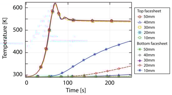 The specific stiffness and strength of most materials decrease with increasing temperature. Although CMCs are suitable for operation at high temperature (above 1000 ℃), the specific mechanical properties are, in absolute terms, lower than the ones of high temperature alloys, i.e., Ni-based superalloys or titanium aluminides. Additionally, operation at high temperature, i.e., approaching the radiative equilibrium temperature at the outer face sheet, while reducing the sensibly stored thermal energy, is cause for high thermal gradients in the out-of-plane direction of the sandwich structure. These gradients, in turn, increase the thermally induced stresses with respect to operation at lower temperatures. Therefore, when considering load-bearing components that require a lightweight, reusable TPS, the choice of material and configuration is not trivial. For a load-bearing component, a reduction of the wall temperature can be beneficial by allowing the use of materials with high specific mechanical properties.