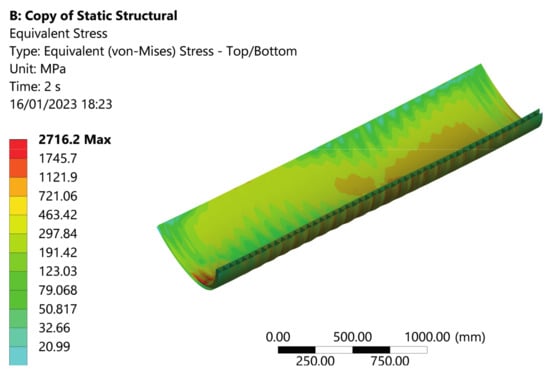 Effective properties for the core are derived from rule of mixtures. As density is based on the volume fractions of the respective materials, a volume rule of mixtures is chosen for this property. In contrast, heat capacity is defined by the respective mass fractions, which leads to a mass rule of mixtures. The respective areas of web and filling are simply the volumes divided by the core thickness . As this factor is common to both volumes, there is no difference between areal and volumetric homogenisation for this case. Thus, homogenisation equations for effective specific heat capacity , effective density , and effective thermal conductivity of the corrugated core are obtained as follows [16]: