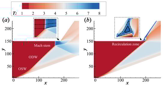 Temperature fields for ODWs in the case of (a) M0 = 5.5; (b) M0 = 6.0. Black curves represent streamlines.