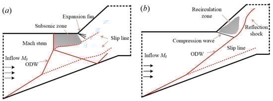 These two typical wave structures are the basis of further study on unsteady ODWs, so their schematics are plotted in Figure 3. With a low M0 5.5, the ODW surface reflects before the corner, leading to the Mach reflection and a Mach stem of detonation, as shown in Figure 3a. The Mach reflection changes the whole wave system, leading to a reflected shock wave, the second slip line, et al. On the other hand, the ODW surface reflects behind the corner with a high M0 6.0, leading to an evidently different wave configuration. As shown in Figure 2b and Figure 3b, a recirculation zone forms behind the outward-turning corner, attributing the ODW decoupling influenced by the expansion wave. Despite different parameters of the chemical-reaction model, these wave structures have been observed in previous studies [], though only steady structures with a fixed M0 were investigated.
