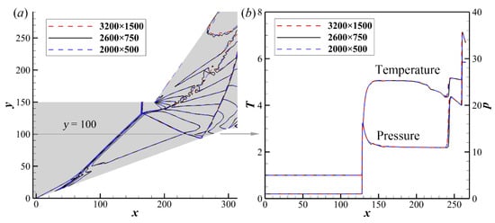 To examine the effects of grid scale on the simulation results, the resolution verification has been carried out by refining the mesh in the directions of x and y, as shown in Figure 4. The temperature contours of ODW with different scales are shown in Figure 4a. Three temperature curves nearly overlap with each other and there are no significant differences in the overall flow structures. Furthermore, the temperature and pressure along the line y = 100 are also compared quantitatively, as shown in Figure 4b. Three groups of grid numbers, i.e., 3200 × 1500, 2600 × 750, and 2000 × 500, are used to solve the ODW flow structure. Based on the 3200 × 1500 scales, the maximum deviation of temperature and pressure occurs near the shock front, which is still less than 5%. For most flow fields, the deviation of state parameters is less than 1%. The quantitative evaluation of the temperature–pressure profiles illustrates almost identical distributions. Furthermore, the wave systems near the wall are the main concern of this study, and the grid near the wall surface has been refined locally to reach as low as 0.06. The cases above have shown that these three groups of grid scales can resolve the ODW structure details, such as reflected shocks, expansion waves, and recirculation zones. Therefore, we believe the grid numbers with 2600 × 750 nodes are sufficient for the present research and will be used in the following simulations.