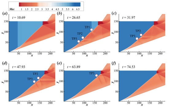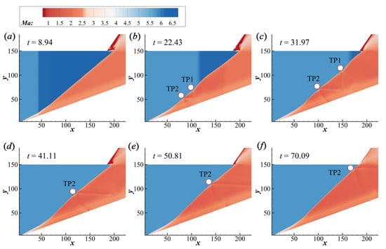 The structural variation of decreasing M0 is shown in Figure 7. Initially, an ODW with M0 6.0 exists, whose structure features a postcorner recirculation zone. Then, the inflow M0 of the left boundary changes from 6.0 to 5.5, and the flow time is reset to zero simultaneously. Similarly, M0 variation also leads to a distortional wave surface, generating two TPs. TP1 also originated from the interaction of the velocity contact and detonation front, however, the movement of the resulting TP1 is slightly slower than the contact surface. Notably, when the contact surface goes through the whole flow fields, TP2 still exists on the surface, which has a slow-moving process to adjust the wave surface. During this process, the recirculation zone becomes smaller but does not disappear until t = 70.09 (Figure 7f).