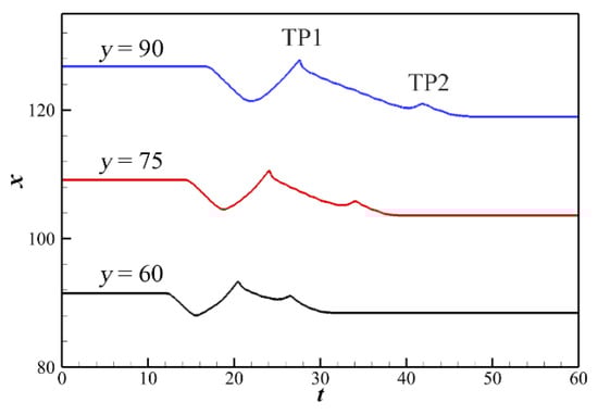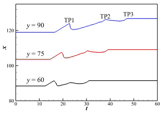 To analyze the ODW surface evolution, the shock-front positions along different lines y = 60, 75, and 90 are recorded as a function of time, as shown in Figure 6. The shock-front location is defined by the local pressure in which the pressure value reaches twice the free inflow. The wave-front position moves downstream, however, it is not monotonous for the appearance of triple points (TPs). Combining the flow fields (Figure 5), it is obvious that the TP1 leads to the first peak of these curves, making the wave front move quickly toward the upstream. On the curves, the effects of TP2 and TP3 on the wave surface are weaker, because TP1 is from the variation of velocity and is accompanied by the discontinuous velocity contact, while TP2 and TP3 are induced to adjust the ODW surface. When comparing the three curves in Figure 6, we found that the velocities of TP2 and TP3 traveling downstream are close, and smaller than the velocity of TP1, so the downstream surface needs a longer time to relax.