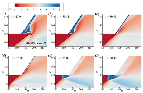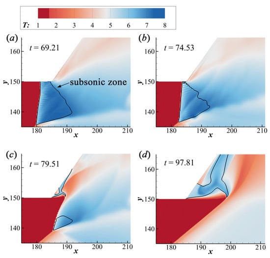 In this section, we investigate the formation of the recirculation zone during the process of the increasing M0. Figure 9 shows the evolution processes of local temperature fields of ODW near the corner, with the black curve denoting the sonic regions. When the M0 increases from 5.5 to 6.0, the Mach stem moves downstream, finally inducing a recirculation zone. It is observed that the Mach stem becomes oblique and the subsonic zone shrinks, splitting into two small parts in Figure 9c. Ultimately, the lower subsonic zone disappears slowly due to the fact that the surface angle of ODW increases continuously, whereas the upper subsonic region is gradually building up and a relatively large recirculation zone arises here. The recirculation zone has been observed previously [], whose formation is attributed to the reversed pressure gradient downstream. The low-temperature region could be observed in Figure 9c, enlarging together with the upper recirculation zone. In general, this work not only supports the formation mechanism of the recirculation zone proposed before but demonstrates that the original subsonic zone might evolve from a Mach stem of detonation and then grows from one extremely small point.