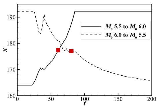 The transformations between the two typical flow structures have shown obvious differences, so the formation and disappearance of the recirculation zone are irreversible. To further analyze the dynamic process, the shock position near the upper wall as a function of time is plotted in Figure 11. The solid and dashed lines are based on the cases with increasing and decreasing M0, respectively, whereas the red squares denote the state when the wave front reaches the turning point. It is observed that when M0 increases from 5.5 to 6.0, the shock front quickly moves downstream and becomes steady within a short time. In contrast, the decreasing M0 results in an extremely long transition time, which should be attributed to the slow-moving Mach stem. Even though the final near-corner structures in unsteady inflow, the M0 remains the same with that steady flow. These processes exhibit that different wave dynamics could be involved with different spatial and temporal characteristics.