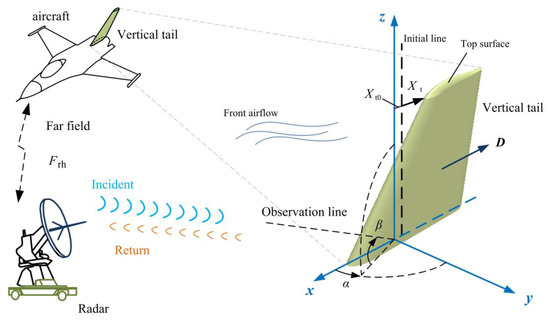 Reasonable tail design affects aircraft performance and flight safety [4], where Reynolds-Averaged Navier–Stokes (RANS) solvers are used to obtain the aerodynamic results under additional flow conditions. The height of the vertical tail, the top surface, the tilt-back angle and the airfoil are considered. The flow field in the vertical tail of the scaled model aircraft under high angle-of-attack flight conditions is simulated [5,6]. In order to optimize the aerodynamic performance of an aircraft wing, detailed steps including the modeling plan, material selection, mesh generation and boundary conditions are presented [7,8]. The problem to be optimized is described, Cowell’s method is used to evaluate the maximum descent time, and the genetic algorithm is used to determine the global optimal solution during the optimization process [9]. The computational fluid dynamics (CFD) method based on the RANS equation is established, and the grids of airfoil surface and flow field space are generated [10,11]. Considering the radar cross-section (RCS) and infrared radiation characteristics, the intake and exhaust system of tailless aircraft is comprehensively designed [12], where unstructured grid technology is used to deal with flow field space. The configuration of a bistatic radar station is introduced, where the azimuth range of the transmitting antenna is 0°~360°, with an accuracy of 0.1° and a speed of 3°/s [13], while the range of required azimuth angles can vary for different observation targets. The vertical tail design with backward tilt can improve the aerodynamic drag characteristics, and the influence on its radar cross-section is worth exploring.