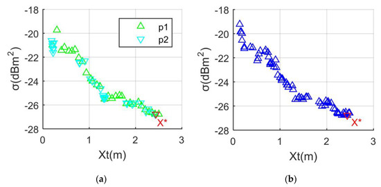Surface scattering analysis: RCS unit: dBm2; α = 25°; Frh = 6 GHz; β = 0°; (a) Case at Xt = 0.3256 m; (b) Case at X*.