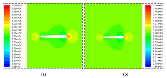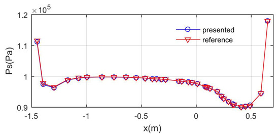 The presented CFD method is verified, as shown in Figure 3, where V∞ refers to the incoming flow velocity, and Ps stands for the static pressure. The reference data come from the calculation results based on the renormalization group (RNG) turbulence model. It can be seen that the static pressure data obtained by the two methods are similar in change amplitude, curve shape, and overall trend. These results show that the CFD presented here is feasible for solving the flow field of the vertical tail.