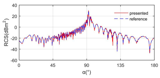 where σt represents the total RCS of the target, subscript F refers to the facet contribution, and E means the edge contribution. NE is the number of edges, and NF represents the number of facets. The calculation method of the radar cross-section is verified, as shown in Figure 4, where the reference data come from the calculation results of PO + MOM (Method of Moment). It can be seen that the two data curves are similar in peak value, mean level, curve shape, and overall trend. These results show that the RCS calculation method presented is able to analyze the electromagnetic scattering characteristics of the vertical tail.