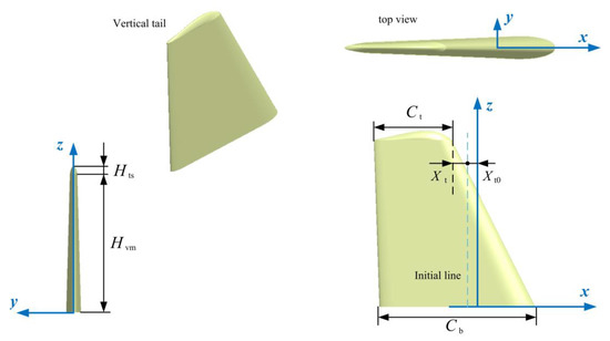 The model of the vertical tail is established, as shown in Figure 5, where the symmetry plane of the vertical tail is always in the xz plane when in the optimization process. In addition, the configuration line of the top surface remains unchanged. The airfoil with a vertical tail section adopts a customized symmetrical airfoil. The data of the end face and height of the vertical tail model are shown in Table 1.