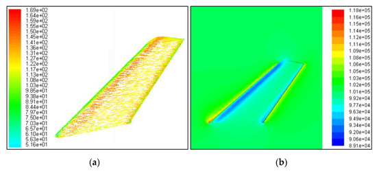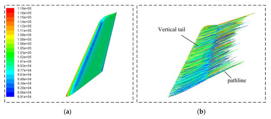 Figure 8 shows that in the current observation section, there is an obvious high-pressure zone near the leading edge of the vertical tail, which is shown in red, where the static pressure can reach 115,975.86 Pa. Under current observation conditions, the Reynolds number of the test case is 17.1 million. The static pressure color changes from red to orange and then to green when viewed from the front edge point along the vertical tail wall to the side. Near the midpoint of the vertical tail side panel, the static pressure is reduced to 98,012.945 Pa. When the observation point continues to move near the tail vertex, the static pressure data recovers to 109,239.77 Pa. Based on flow field calculation results, the aerodynamic moment around the positive direction of the z-axis is −146.4263 N∙m. These results show that the CFD method established here is feasible to analyze the flow field characteristics of this vertical tail under current conditions.