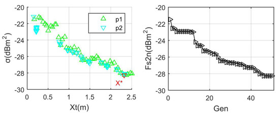 The presented search algorithm is verified, as shown in Figure 2, where the improved SA algorithm is used to obtain comparative data. For the SA method, the initialization temperature is set to 300 °C, and the final judgment temperature is 0.01 °C. The temperature drop rate is equal to 0.51, and the solution space size is equal to 5. The optimal solution obtained by this SA method is 2.4432 m, where the RCS indicator is −26.8021 dBm2. It can be seen that the change rule of the RCS index with Xt displayed by the search algorithm is obvious. For the TPS method, the number of iterations is set to 30, where Cn = 0.5, p1 stands for particle 1, and p2 refers to particle 2. The optimal solution determined by TPS is 2.4322 m, where the RCS indicator is −26.8048 dBm2. These results show that the presented TPS algorithm is able to assist in optimizing the performance index of the vertical tail.