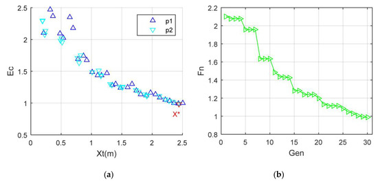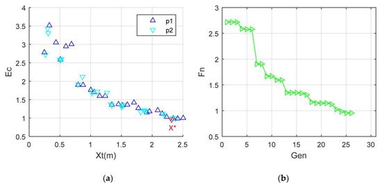 Since Cqw1 < Cqw2, the comprehensive evaluation index of the vertical tail is more affected by the stealth performance. Figure 15 shows that the initial size of Ec is obviously higher than that of the aero-stealth optimization. When Xt = 0.3256 m, the value of Ec is as high as 3.518. Because of the scattering contribution of the vertical tail leading edge and the front-to-side surface, the conversion of stealth performance makes the initial Ec level higher. As Xt increases to 0.8003 m, the value of Ec rapidly decreases to 1.913. It can be found that the optimal solution determined by TPS is X* = 2.3145 m, and the comprehensive evaluation index at this time is 0.9555. Because of different quantitative weight distributions, the optimal solution here is different from that of the previous aero-stealth optimization example. Between Xt = 0.65 m and Xt = 0.82 m, the reduction in the comprehensive evaluation index is obvious. Near the optimal solution, some feasible solutions with a low comprehensive evaluation index exist, including Xt = 2.235 m and Xt = 2.374 m. Due to the impact of multiple fluctuations in the RCS–Xt curve, Ec-Xt data features also exhibit many minimum values. As the number of iterations increases to 11, the value of Fn decreases rapidly to 1.597. When Gen = 24, the value of Fn is as low as 0.9862. It can be noted that the overall performance of the Fn–Gen curve is satisfactory under current conditions. Compared with the case where the aerodynamic weight coefficient is greater than the stealth weight coefficient, the initial level of the fitness indicator here is still slightly higher. When the number of iterations increases from 6 to 7, the fitness index decreases dramatically because at this time, two particles in the search algorithm have accumulated a certain number of initial samples and updated the individuals with the current minimum fitness, which significantly reduces the fitness of particle 2.