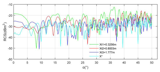 Figure 17 shows that the RCS performance of the vertical tail in the given range after comprehensive optimization is satisfactory. When Xt = 0.3256 m, the RCS curve has several peaks exceeding −16.18 dBm2, where the RCS mean is −21.1199 dBm2. At this time, the aerodynamic resistance of the vertical tail is 1174.896 N. With Xt increasing to 0.8003 m, the peak value of the RCS curve is significantly weakened, and the average RCS is reduced to −24.6751 dBm2, where the drag index is 1073.162 N. For the case at Xt = 1.777 m, the RCS mean is −26.8057 dBm2, where the aerodynamic resistance of the vertical tail is 854.895 N. At α = 40.75°, the RCS of the X* curve is −40.43 dBm2, and that of the X* curve is −16.07 dBm2 because the scattering characteristics of the front-to-side transition surface of the vertical tail are weakened. Compared with the other three RCS curves, the curve of X* has a smaller local peak and a lower mean level. The RCS mean of the X* curve is −28.6256 dBm2, where the drag index is 800.8665 N. It can be seen that the aerodynamic performance index and stealth performance index of the optimized vertical tail have been improved. These results show that different quantitative weight coefficients can still be combined with the established TPS algorithm to realize the stealth-aerodynamic optimization of the vertical tail.