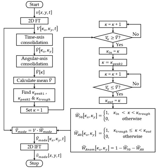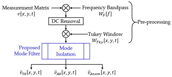 In this work, an adaptive mode filter is proposed to isolate a specific mode of interest, so that further analysis or processing for damage visualization can be performed. Figure 1 depicts a typical process flow. Before mode isolation, the measured wavefield dataset undergoes several pre-processing steps, namely the frequency bandpass, DC removal, and Tukey windowing. The frequency bandpass is used to remove noises such as environmental vibration and sampling aliasing; DC removal is used to remove the amplitude shift; and Tukey windowing is used to reduce the spectral leakage in Fourier transformation. The pre-processed data would then be fed into the proposed mode filter to isolate the S0, A0, and the damage-related anomalous modes.