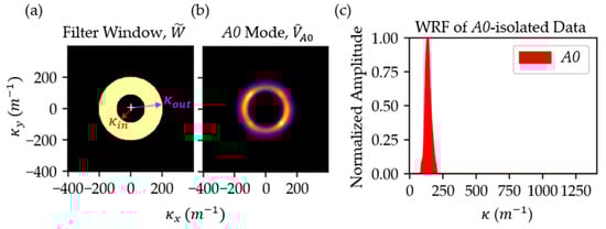where represents the single-mode-filtered wavefield data. Figure 4b shows a sample TCWS of based upon its corresponding unfiltered TCWS as previously shown in Figure 3a. Figure 4c shows the corresponding A0-isolated WRF. From a number of attempts made by the authors, it was found that even though the data consolidation results in TCWS and WRF of different shapes and amplitudes, the filter windows can be employed to isolate the modes effectively. In other words, the adaptability of the proposed mode filter is anchored at the representation of wavefield data using the WRF.