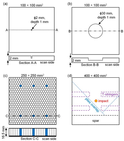 Improved damage visualization based on mode-isolated data was demonstrated using four specimens with artificial damage. In the first two cases, a stainless-steel plate was used to represent a simple, homogeneous structure. A blind hole was drilled and a circular area was milled on the opposite side of the specimen, respectively, for Cases D1 and D2, to simulate scatterer-type damage-like cracks and hidden corrosion. The damage diameter was large compared to the ultrasound wavelength in Case D2, so the ultrasound perceived it as areal-type damage, unlike in Case D1. Illustrations of the imaging ROI for all damaged cases are given in Figure 5.