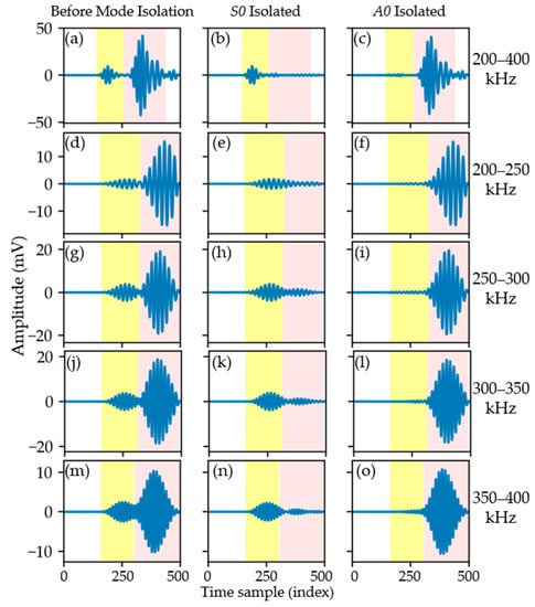 An example of time-domain signal taken from the data of inspection Case P1. The left, middle, and right columns show the signals before mode isolation, after S0 mode isolation, and after A0 mode isolation, respectively. Sub-figures (a–c) show the as-acquired broadband signal, while sub-figures (d–o) show the signals after being software-filtered at different frequency bandpass ranges, as indicated at the far right. Time zones with a yellow and pink background were used for the ER calculation of S0 mode and A0 mode, respectively.