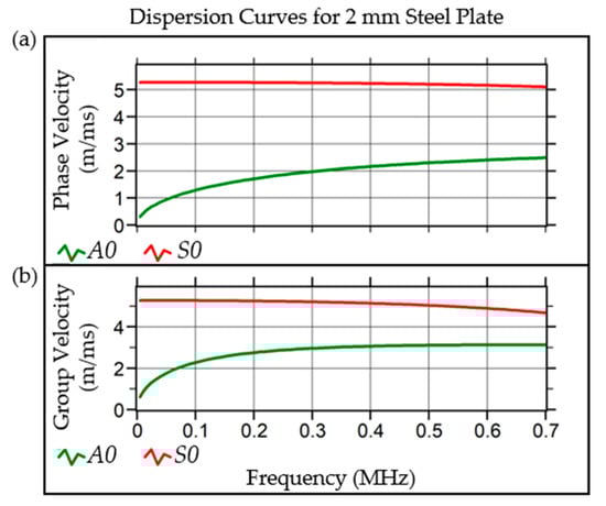 Plots of (a) phase velocity and (b) group velocity dispersion curves for the 2 mm steel plate used in Case P1, generated using Vallen Dispersion software [].