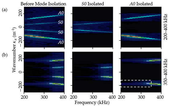 The efficiency of the mode filter can also be inspected in the wavenumber-frequency domain. By converting the wavefield data into the wavenumber-frequency domain using 3D FT, the modes can be compressed into respective dispersion curves. This provides a convenient avenue to check whether the partially overlapped S0 and A0 modes in the time domain, as shown in Figure 6m, was completely separated by the mode filter in the wavenumber-frequency domain. Figure 8a,b show the wavenumber-frequency spectrums at for wavefield data in the 200–400 kHz and 350–400 kHz frequency bands, respectively. The spectrum before mode isolation in Figure 8a shows the distribution of energy over the wavenumber-frequency domain, in which the S0 mode can be seen to form two curves that are located closer to the horizontal axis , while the A0 mode formed the top and bottom curves. The energy content of the A0 mode is comparatively higher than the S0 mode, consistent with that shown in Figure 6a. A complete separation of modes can be seen in the middle and right spectrums of Figure 8a after applying the mode filter. Figure 8b shows the spectrum corresponding to the time-domain signal shown in Figure 6m,n,o. The partial overlap of the S0 mode and A0 mode in the time domain is not seen in the wavenumber-frequency domain. This simply proved that the residual of the A0 mode within the pink time zone in Figure 6e,h,k,n was not caused by the inefficiency of the proposed mode filter. Instead, close examination of the spectrums shows that there were energy leakages during the frequency bandpass, as indicated by non-zero energy distribution within the white dashed box in Figure 8b. Note that the box spans frequencies from 200 kHz to 350 kHz and should contain no energy if the frequency bandpass was performed without leakage. How the energy leakage in the frequency domain affected the time domain signal and how the software bandpass could be configured to reduce or mitigate energy leakage are subjected to further investigation beyond the scope of this paper.