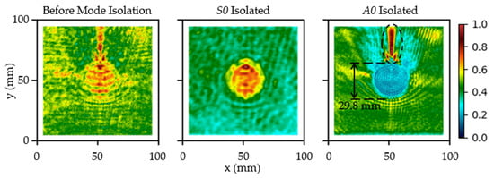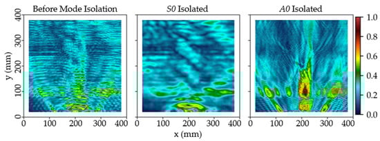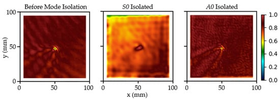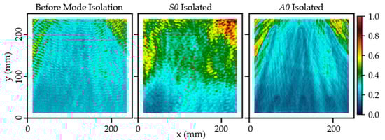 Although only one sample solution of the isolated mode is presented in Figure 3 and Figure 4, the proposed mode filter can actually generate all three S0-isolated, A0-isolated, and anomalous mode-isolated wavefield data in one execution of the algorithm. The anomalous mode will contain energy only when a portion of energy from the incident modes is mode-converted by a damage.