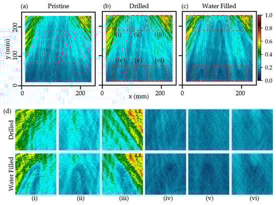 In order to have easier damage identification, the SEM processed from the A0-isolated data at the pristine (as manufactured) state, after the drilling of six water-injecting holes on the opposite side of the specimen, and after the cells were filled with water, were generated for comparison, as shown in Figure 12a–c, respectively. The nearly identical Figure 12a,b prove that the drilling of six water-injecting holes at the opposite side of the specimen did not alter the energy distribution of the wavefield. The energy distribution was disturbed only after water was injected into the selected cells, which can be seen by comparing Figure 12b,c. Six small regions around the water-filled cells, indicated by red dashed boxes (i)–(vi), were enlarged and given in Figure 12d for easier comparisons. The three water-filled cells within regions (i)–(iii) are more apparent in the enlarged SEM, in which the wake pattern as well as the reduction in energy can be seen. The other three water-filled cells within regions (iv)–(vi) are hard to identify due to the low availability wavefield energy at the bottom of the ROI. In this case, the source of the wavefield was located far above the inspection ROI, i.e., at (125, 375) mm. Almost all the wavefield energy was dissipated or directed to the left and right sides of the specimen (beyond the inspection ROI) due to the wave-guiding nature of the honeycomb core [,]. The remaining energy reaching the three water-filled cells at the bottom cannot create sufficient contrast for visualization.