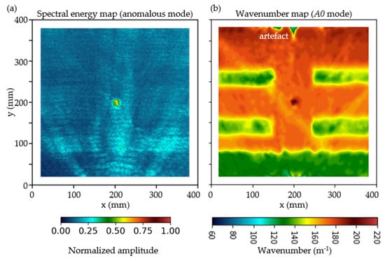 The adaptability of the mode filter for complex structure inspection can be demonstrated by removing all incident modes when necessary. When all incident modes, including those related to benign structural components, were removed, the wavefield data only contained a damage-induced anomalous mode, which is denoted as as given previously in Figure 1. The filtered data can also be processed as SEM, as shown in Figure 14a. In this case, the SEM shows high-energy distribution at the damaged region, and thus highlights the damage for easy detection. At the same time, the energies of all waves related to benign structural components were suppressed, until the structural components can barely be visualized. To prove that the proposed mode filter also facilitates the mode isolation for structural imaging, the A0-isolated data , also previously shown in Figure 1, was processed using the modified wavenumber imaging algorithm (see Section 3.3.2) as a wavenumber map, as shown in Figure 14b. In this wavenumber map, the spar flange is shown in green, correspond to a wavenumber value of approximately 130 m−1; the four stringers are shown in greenish-yellow (~145 m−1); the ply overlapped regions are shown in yellowish-orange (~167 m−1); and the nominal 2 mm skin is shown in orange (~173 m−1). The impact damage, which can be identified at the centre of the image, is shown in maroon (~196 m−1). The artefact that is most probably due to non-optimum parameter settings in the wavenumber imaging can be seen at the top, subjected to further investigation. Note that the wavenumber value is a physical value of the specimen, which can be converted to specimen thickness if necessary [,]. The significant improvement in damage visibility by comparing Figure 13 and Figure 14a proves that the proposed mode filter has an excellent adaptability for simple specimens and complex structures. Figure 14 also proves that the proposed mode filter is highly adaptive for isotopic metallic specimens and anisotropic composite structures.