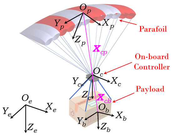The system structure and four coordinate frames to establish the 9-DOF model of a PRS is illustrated in Figure 1. is the Earth-fixed inertial frame with the origin being an arbitrary point on the ground. is another reference frame with the origin being the controller’s center , whose axes are parallel to that of . Both and are body-fixed frame, and their coordinate origins are parafoil’s center and payload’s center , respectively. and represents the distance between the parafoil’s center and the controller’s center , and the distance between the payload’s center and the controller’s center , respectively.