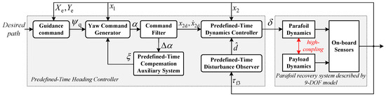 Assuming that a PRS has sufficient sensors and GPS to measure the parafoil attitude , system velocity and position , then the control objective is stated as follows. For a PRS described by (29), design a predefined-time heading controller to ensure that the desired path can be followed in a predefined time despite uncertainties and the subsystem’s coupling.