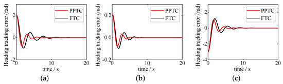 The heading tracking errors of the PPTC and FTC(a) Case 1; (b) Case 2; (c) Case 3.